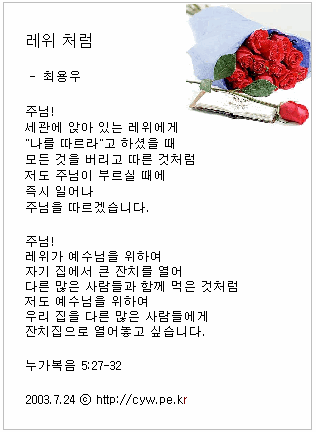 레위처럼주님!세관에 앉아 있는 레위에게"나를 따르라"고 하셨을 때모든 것을 버리고 따른 것처럼저도 주님이 부르실 때에즉시 일어나 주님을 따르겠습니다.주님!레위가 예수님을 위하여자기 집에서 큰 잔치를 열어다른 많은 사람들과 함께 먹은 것처럼저도 예수님을 위하여우리 집을 다른 많은 사람들에게잔치집으로 열어놓고 싶습니다.누가복음 5:27-32 2003.7.24 ⓒ최용우